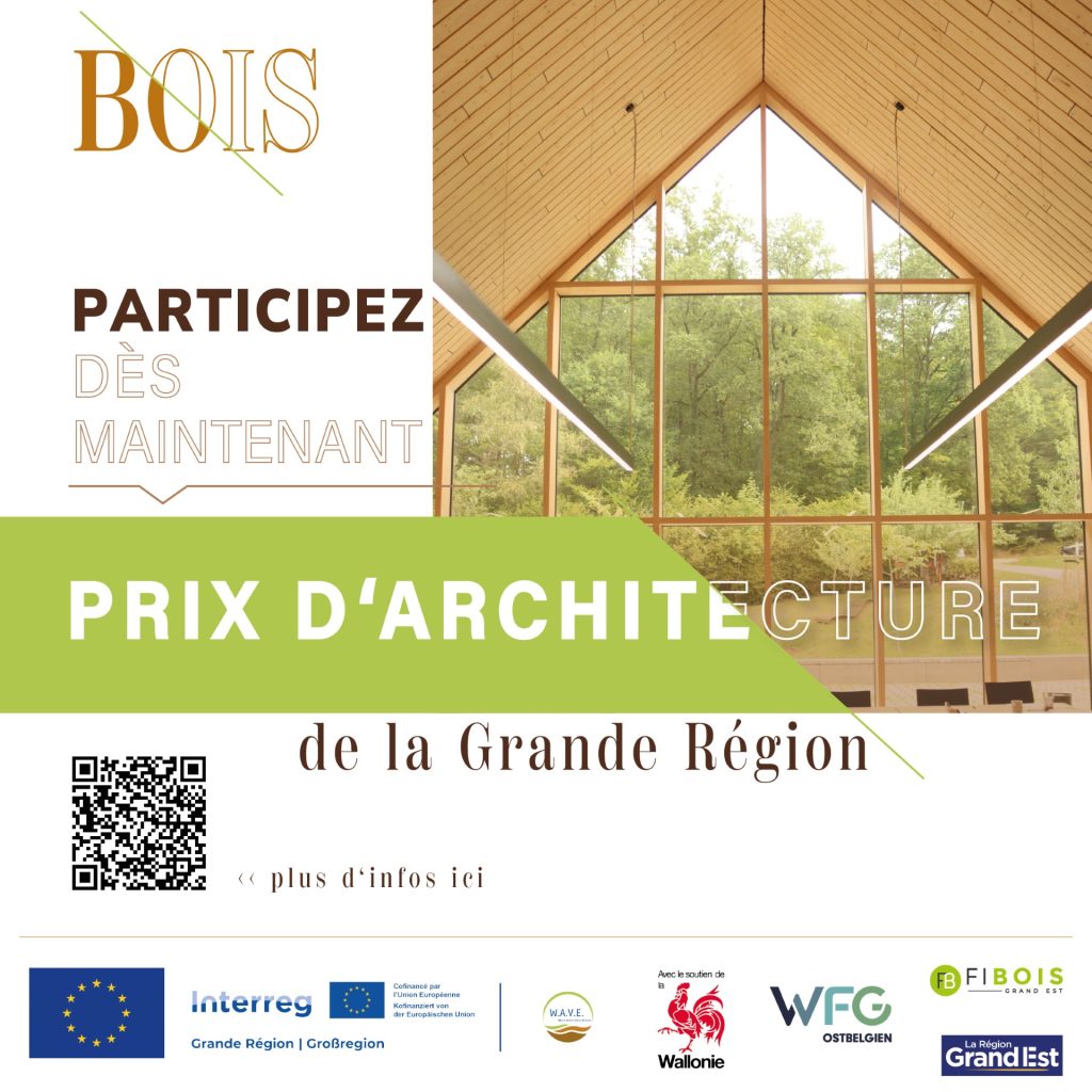 Que vous soyez maître d’ouvrage, maître d’œuvre, entreprise ou bureau d’études, vous avez jusqu’au 19 mars pour soumettre vos projets de construction et d’architecture intérieure en bois au Prix d’Architecture de la Grande Région, un projet porté par l’Interreg W.A.V.E. (Wood Added Value Enabler) !