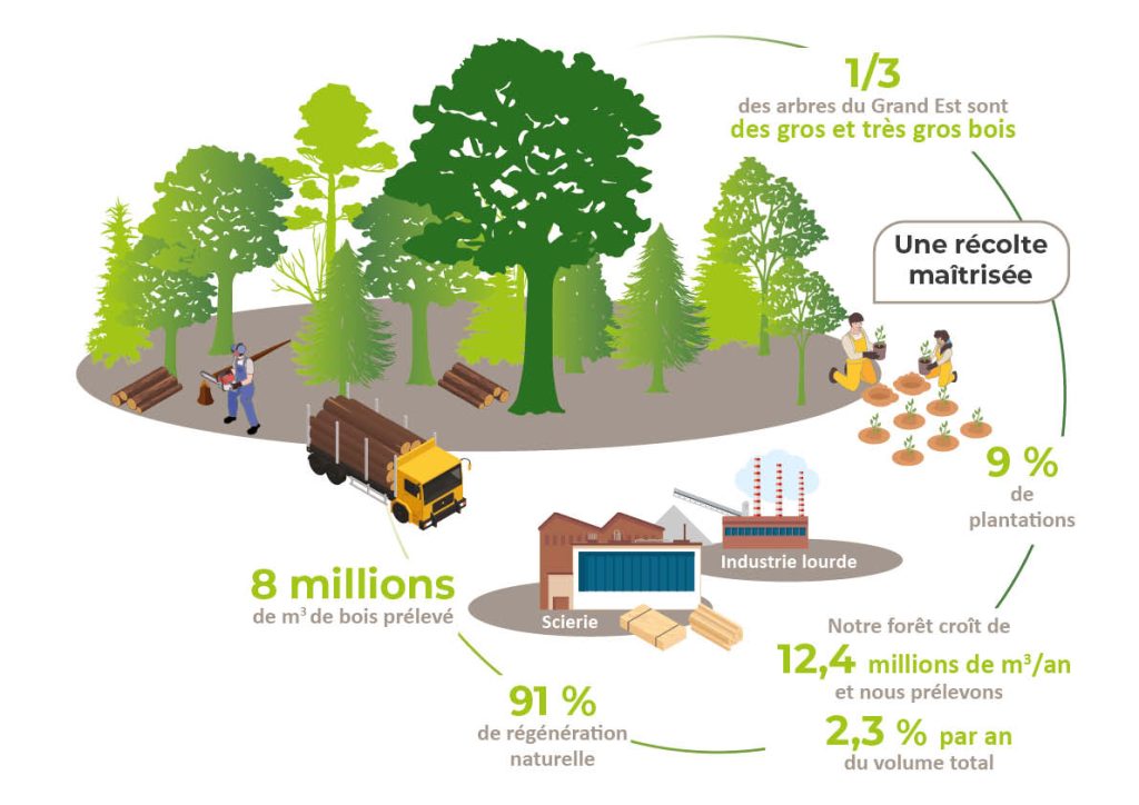 La forêt du Grand Est s’étend sur 1,9 million d’hectares (presque 2 millions de terrains de football) et continue de croître chaque année. Composée à 80 % d’espèces feuillues, et 90 % de sa surface se régénère naturellement. Sa gestion est assurée par différents professionnels : experts, coopératives et techniciens pour les forêts privées, et l’ONF pour les forêts publiques. Cette gestion concilie économie et environnement. Elle maintient des emplois locaux, soutient l’industrie du bois, capture le carbone et préserve la biodiversité. En forêt publique, l’accueil du public est également mis en avant grâce aux parcours santé et sentiers didactiques.