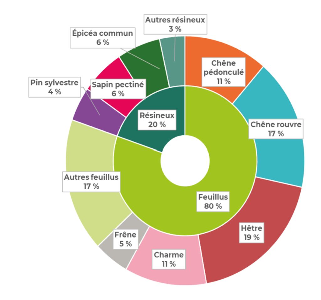 Dans le Grand Est, 80 % des surfaces forestières sont certes de feuillus, et 20 % de résineux. Les chênes sont majoritaires, ils représentent 28 % des peuplements, puis vient le hêtre avec 19 % et le charme avec 11 %.
