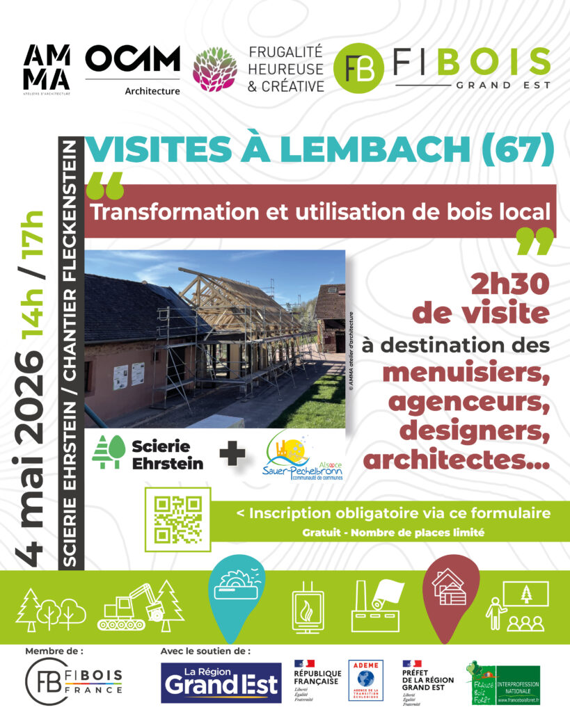 Dans le cadre de ses actions de valorisation de la ressource forestière régionale, FIBOIS Grand Est co-organise, avec La Frugalité heureuse & créative, AMMA Atelier d’architecture et OCAM Architecture un après-midi dédié à la transformation et à l’utilisation de bois local, le lundi 4 mai à partir de 14h, à Lembach (67). L’événement est ouvert sur inscription préalable.